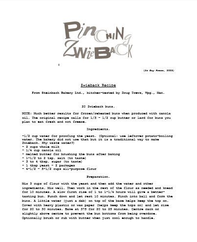 • Pinching Zwieback Toews’s debut collection is a blend of memory, fable, and trauma that explores life experiences in the fictional Mennonite prairie town of “Hartplatz”. The book has been well-reviewed, appeared on several local bestseller lists, and is being discussed in book clubs.
