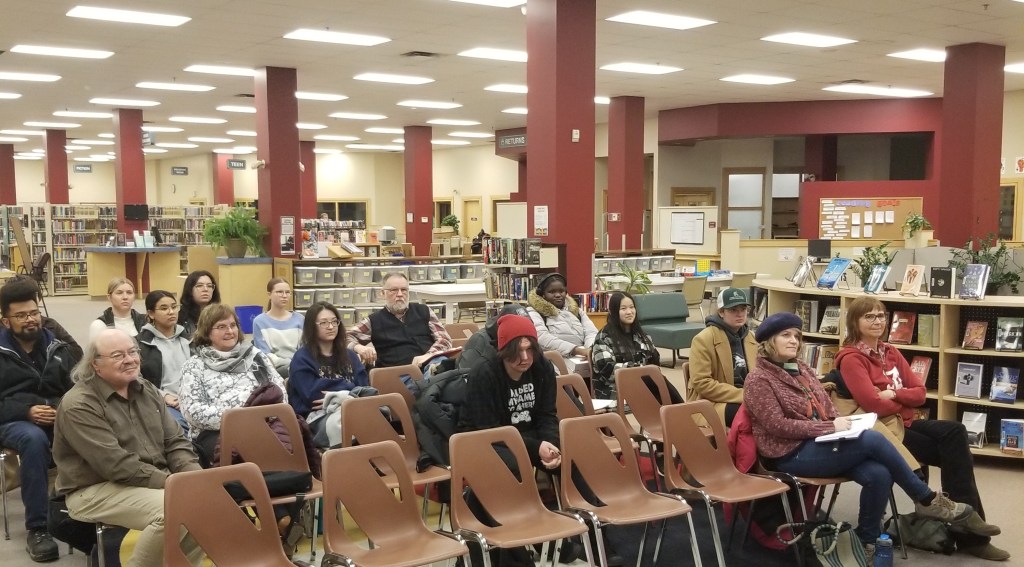 CHEERS to playwright and English & Creative Writing Asst. Prof. Dale Lakevold. He brought along a swarm of talented students from Brandon University, and like the Marino’s Pizza he supplied before the event, his contribution made our day. Thanks too to WMRL Mgr. of Programming & Community Svcs., Alex Rogowsky who prepped and managed our twinkly evening.