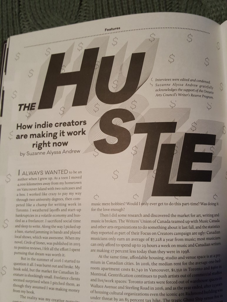 It has come to my attention, thanks to a wonderful article in Broken Pencil Issue 74 by Suzanne Alyssa Andrew (The Hustle, page 20) that, in Canada, “the market for art, writing, and music is broken.”